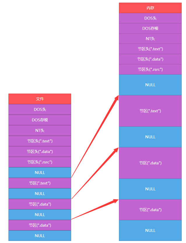 PE头与各节区的尾部存在一个区域,称为NULL填充(NULL padding)。(PE文件中文件/内存中节区的起始位置应该在各文件/内存最小单位的倍数位置之上,空白区域将用NULL填充。)